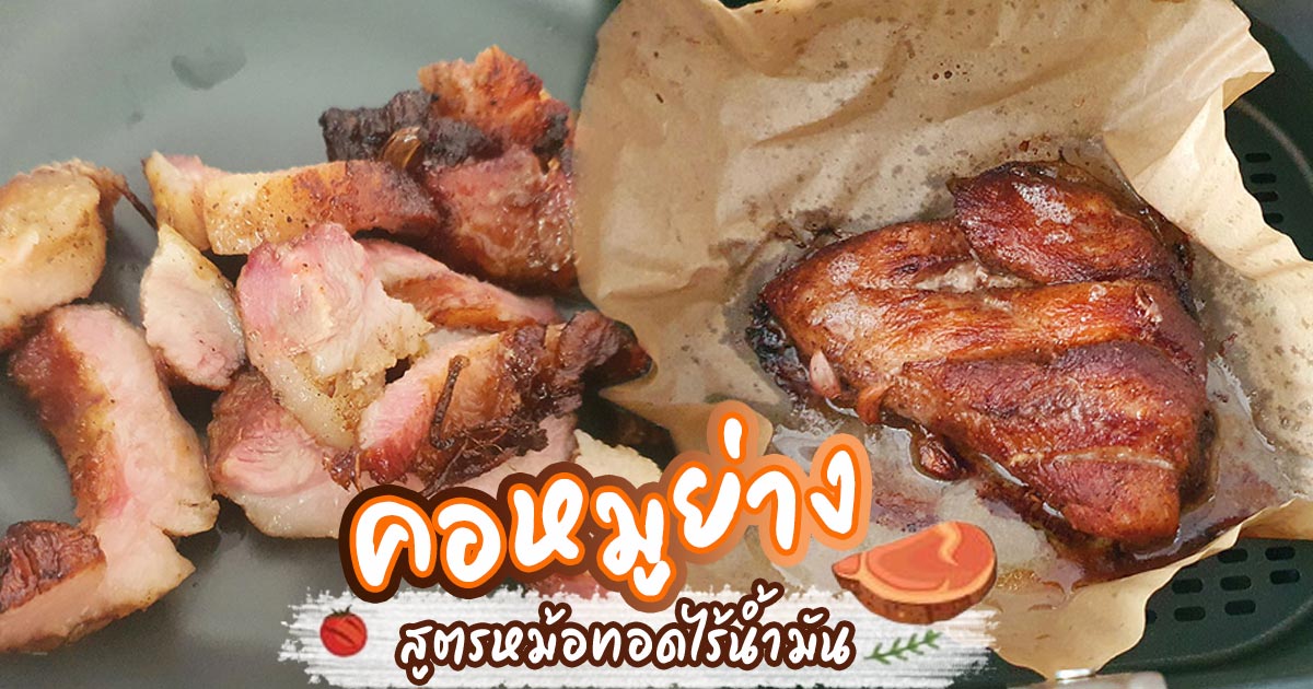 คอหมูย่าง หม้อทอดไร้น้ำมัน สูตรไม่ย่าง เมนูอาหารทำง่าย ๆ แต่อร่อย เพียงแค่หมักหมู เข้าหม้อทอด รอกินเนื้อหมูกรอบนอก นุ่มใน ไม่เหนียว กับข้าวร้อน ๆ ได้เลย สวัสดีค่ะ วันนี้เรามีอีกหนึ่งเมนูสำหรับคนไม่ค่อยชอบทำกับข้าว หรือคนที่อยู่หอคนเดียว แต่ต้องการกินกับข้าวอร่อย ๆ สำหรับเมนูที่จะมาแนะนำวันนี้คือ เมนูคอหมูย่าง สูตรไม่ย่าง แต่ใช้หม้อทอดน้ำมัน วิธีทำแสนง่าย แต่ได้รสชาติอร่อยเกินคาด คอหมู 300 กรัม ด้วยความที่ชอบมันเราเลยให้พ่อค้าเอาชิ้นที่ติดมันให้เป็นพิเศษ รากผักชี 4 ต้น ชอบความหอม ๆ เวลาอบเลยใส่เยอะค่ะ พริกไทยแบบขวดป่น ½ ช้อนโต๊ะ กระเทียมประมาณ 1 หยิบมือ หรือ 1 หัว ซีอิ๊วขาว 1 ช้อนโต๊ะ ซอสหอยนางรม 1 ช้อนโต๊ะ แม็กกี้ 1 ชิ้นโต๊ะ รสดี ปลายช้อน น้ำตาล ปลายช้อน เพื่อให้เวลาเอาเข้าหม้อทอด สีจะดูดีน่ากิน เราไม่ใส่เกลือนะคะ เพราะแค่ซอส ซีอิ๊ว แม็กกี้ รสดี ก็นัวแล้ว นำหมูมาล้างน้ำให้สะอาด เราใส่เกลือในน้ำตอนล้างไปนิดหน่อย เพื่อดับกลิ่นคาว ล้างรากผักชี กระเทียม พักให้สะเด็ดน้ำ นำรากผักชี กระเทียม ตำไม่ต้องละเอียดมากนะคะ นำหมูใส่ภาชนะ ปรุงด้วยเครื่องปรุงที่เตรียมไว้ ขยำ ๆ ให้เข้ากับเนื้อหมู นำภาชนะเข้าตู้เย็น เพื่อหมูจะได้เข้าเครื่องหมัก แต่สำหรับคนที่ไม่มีเวลาแนะนำให้พักไว้สัก 30 นาที นำใส่หม้อทอดอบลมร้อน ตั้งอุณหภูมิ 180 องศา นาน 25 นาที (เราไม่พลิกกลับด้านนะคะ พอดีไปทำอย่างอื่นต่อ เลยตั้งทิ้งไว้ยาว ๆ) รอหม้อเด้ง ติ๊ง ๆ ก็นำหมูออกจากหม้อทอด รอเสิร์ฟใส่จานได้เลย ปกติแนะนำให้หมักหมูและทิ้งไว้ข้ามคืนก่อน จะทำให้หมูที่หมักเข้าเนื้อทุกส่วน ถ้าต้องการเพิ่มความสมดุลของหมูทั้ง 2 ด้านให้ตั้งที่ 10 นาที และพลิกกลับอีกด้านหนึ่งจะได้เนื้อหมูทอดเกรียม ๆ เท่ากัน แนะนำให้กินคู่กับน้ำจิ้มแจ่ว พร้อมผักสด ๆ รับรองอร่อยเหาะ กินกับข้าวร้อน ๆ จะเป็นข้าวหอมมะลิ หรือข้าวเหนียวร้อน ๆ แล้วแต่ความชอบเลยค่ะ แนะนำว่าให้ใช้กระดาษรองหม้อทอดไร้น้ำมัน ใส่รองหมูก็ดีค่ะ เพื่อเราจะได้ไม่ต้องล้างหม้อทอดเยอะค่ะ ความกรอบ นุ่ม ของเนื้อ แล้วแต่เราปรับอุณหภูมิเลยค่ะ ถ้าชอบกรอบนอก นุ่มใน ก็ไฟแรง ๆ ไปเลย แกงจืดตำลึงเต้าหู้หมูสับ เมนูน้ำซุปรสเลิศ สูตรทำกินเองง่าย ๆ หอมกรุ่นพริกไทย ปีกไก่ทอดกระเทียมพริกไทย สูตรความอร่อยหนังกรอบ เนื้อนุ่ม หอมกรุ่นเครื่องเทศ