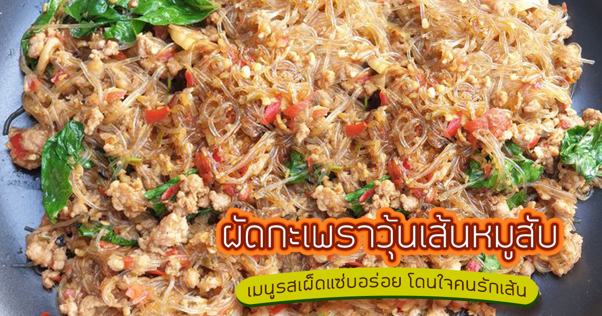 ผัดกะเพราวุ้นเส้นหมูสับ..กับข้าวธรรมด๊าธรรมดา พริก หมูสับ วุ้นเส้น กระเทียม/กะเพรา น้ำปลา/น้ำตาล/ซีอิ๊วดำ/น้ำมันหอย น้ำมัน โขลกพริกกระเทียมให้พอแหลก เอาไปผัดให้หอม ใส่หมูสับลงไปผัดให้เข้ากัน จากนั้นเหยาะซีอิ๊วดำเล็กน้อย เมื่อหมูใกล้สุกใส่วุ้นเส้นปรุงรสด้วยน้ำปลา น้ำตาล/น้ำมันหอยลงไปผัดให้เข้ากัน ใส่กะเพราลงไปผัดให้เข้ากันอย่างเร็วจนสุกดีตักใส่จานได้เลย