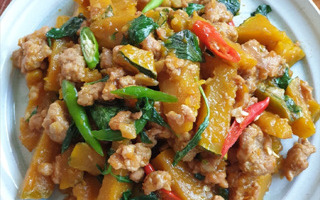 ผัดฟักทองกับหมูสับใส่โหระพา..อร่อยมากกก หมูสับ ฟักทองหั่นชิ้น พริกจินดาหั่นชิ้น กระเทียมสับ/โหระพา น้ำมันหอย/ซีอิ๊วขาว น้ำตาล น้ำมัน/น้ำเปล่า น้ำปูนใส แช่ฟักทองในน้ำปูนใสอย่างน้อย 30 นาที ล้างผ่านน้ำให้สะอาดพักไว้ให้สะเด็ดน้ำ เจียวกระเทียมให้หอม ใส่หมูสับลงไป ผัดให้เข้ากัน ใส่ฟักทองลงไปเติมน้ำเปล่าเล็กน้อย ผัดจนฟักทองเริ่มนุ่ม ปรุงรสด้วยน้ำมันหอย ซีอิ๊วขาว น้ำตาลผัดให้เข้ากัน ใส่พริกและโหระพาลงไปผัดให้เข้ากันอย่างเร็ว..ตักเสิร์ฟได้เลย