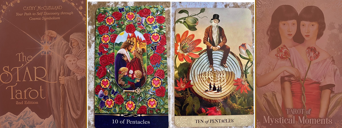 ใบซ้ายมือเป็นไพ่ชุด The Star Tarot เหรียญในภาพล้อมรอบด้วยดอกกุหลาบสีแดง ภาพคู่ชายหญิงจนทำให้อาจเข้าใจผิดว่าเป็นไพ่คู่รัก หรือไพ่สิบถ้วยไปได้ ความหมายของใบนี้ในสำรับนี้บ่งบอกถึงความสมดุลในชีวิตทุกด้าน ไม่ว่าจะเป็นชีวิตครอบครัว ชีวิตการทำงาน ความสุขสบายหรูหราในรูปแบบการดำเนินชีวิต รวมไปถึงสุขภาพก็แข็งแรงด้วย เรียกว่าดีครบสูตร