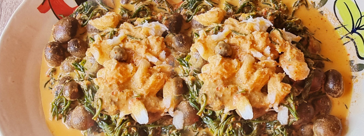 แกงเผ็ดเห็ดเผาะ ใบชะคราม โรยด้วยเนื้อปูก้อน