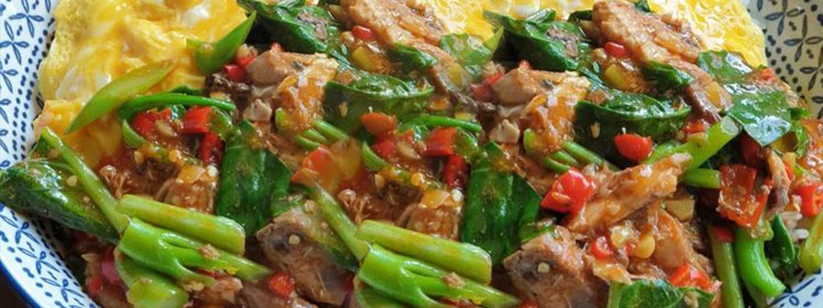 ผัดคะน้ากับปลากระป๋องราดข้าว กับข้าวบ้านๆแต่อร่อย
