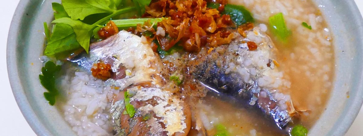 ผมต้มข้าวต้ม ด้วยข้าวสาร มีข้าวเหนียวปนนิดหน่อย ต้มพอข้าวต้มสุก ผมแยกเอาเนื้อปลากระป๋องมาใส่ลงไป ส่วนน้ำซอสปลากระป๋อง เอามาเจียวกับไข่ ซอยพริกใส่ลงไป ทอดหอมๆ ครับ สีอาจจะเข้มหน่อย สีเข้มเพราะจากซอสปลากระป๋อง