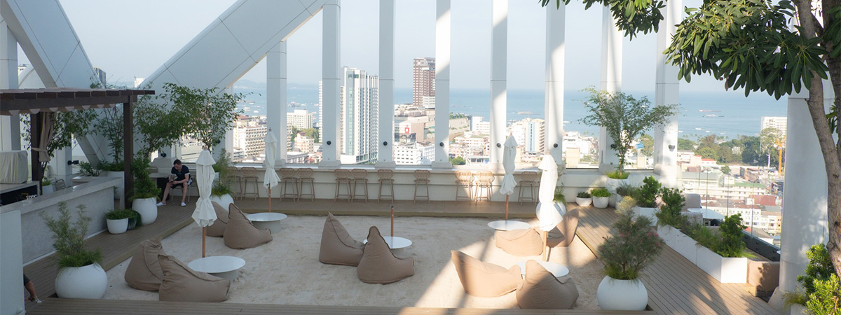 พื้นที่ชั้นดาดฟ้าก็ถือเป็นอีกหนึ่งไฮไลต์ของที่นี่ เพราะมีทั้ง Rooftop Bar ที่ให้บริการเครื่องดื่มต่างๆ และสระว่ายน้ำ ที่เราสามารถ enjoy กับวิวเมืองวิวทะเล รวมถึงวิวพระอาทิตย์ตกที่สวยงามได้